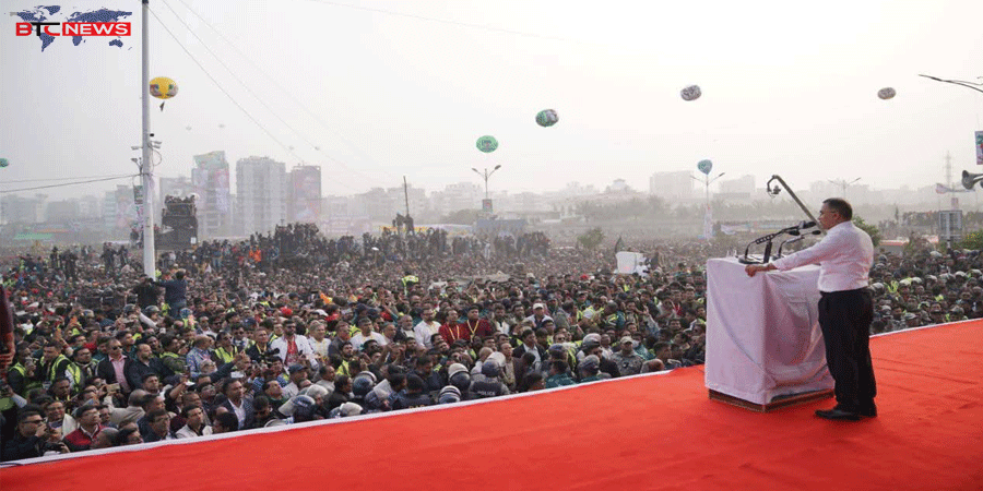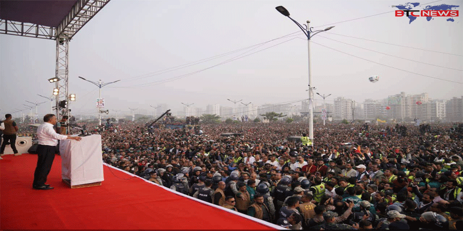 সংবর্ধনাস্থলে পৌঁছে তারেক রহমান উপস্থিত লাখ লাখ নেতাকর্মী ও সারা দেশের মানুষের উদ্দেশে এক ঔতিহাসিক ভাষণ দেন।
