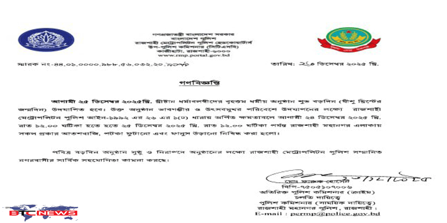 উক্ত অনুষ্ঠান নির্বিঘ্ন ও উৎসবমুখর পরিবেশে সুষ্ঠুভাবে সম্পন্ন করার লক্ষ্যে রাজশাহী মেট্রোপলিটন পুলিশ আইন, ১৯৯২-এর ২৬ (১) (ঢ) ধারায় অর্পিত ক্ষমতাবলে আগামী ২৪ ডিসেম্বর ২০২৫ খ্রিষ্টাব্দ রাত ১২.০০ ঘটিকা হতে ২৫ ডিসেম্বর ২০২৫ খ্রিষ্টাব্দ রাত ১২.০০ ঘটিকা পর্যন্ত রাজশাহী মহানগর এলাকার সর্বত্র সকল প্রকার আতশবাজি ও পটকা ফুটানো এবং ফানুস উড়ানো সম্পূর্ণরূপে নিষিদ্ধ করা হয়েছে।